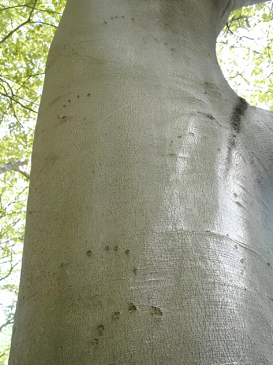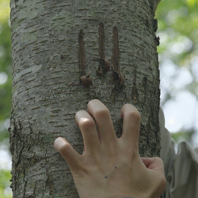 樹種によっては爪痕は目立ちにくい。左の写真はイヌブナの木を登った後の爪痕。急いで降りた跡は縦に長く伸びる爪痕ができるが、実際には5本の爪が木に食い込んでいたような点状の爪痕になることが多い。枝先にある木の実や葉を食べるために登る。その他には逃げる時や休憩する時に登っている。爪痕部分と樹皮の色が同じ色であれば古い爪痕。