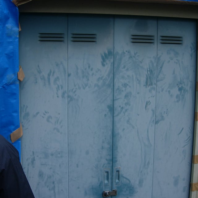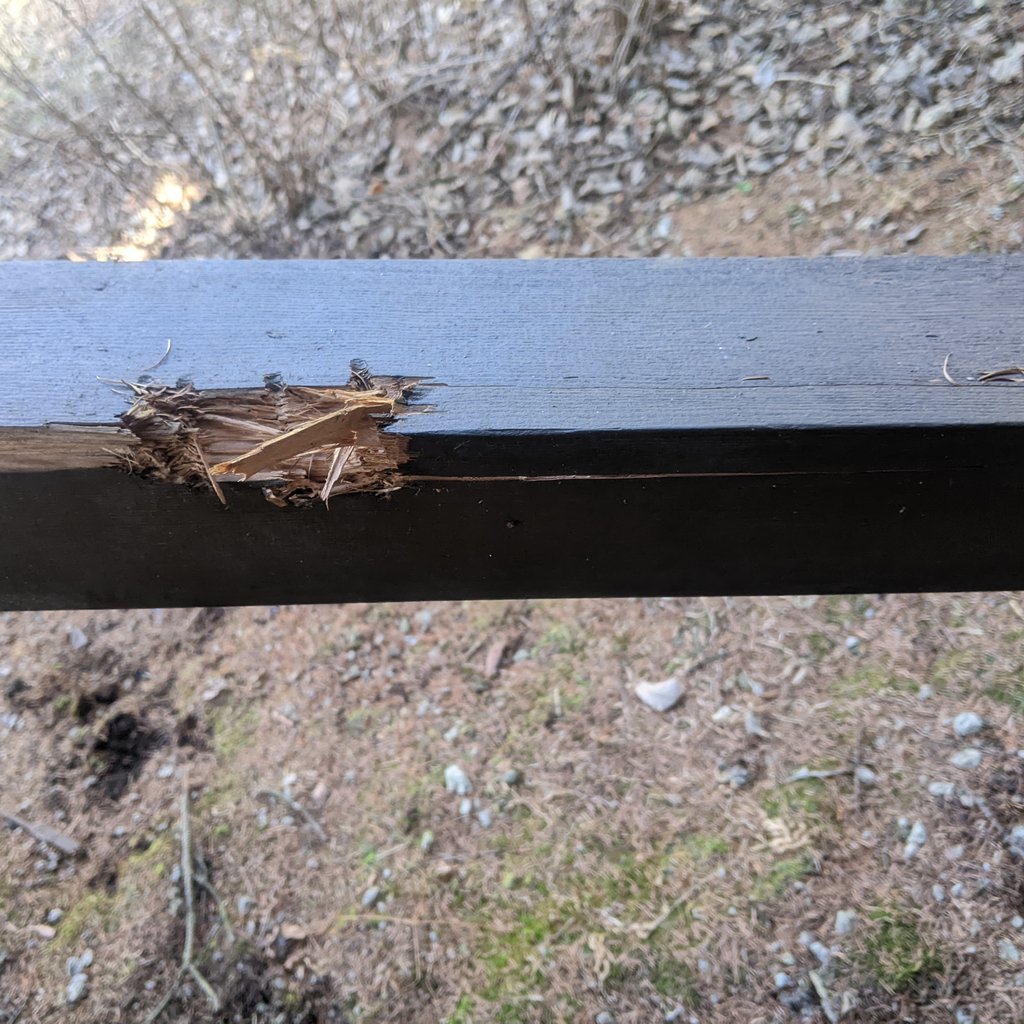 塗りたてのペンキを齧った跡。ガソリンやペンキなどの匂いはクマは好き。