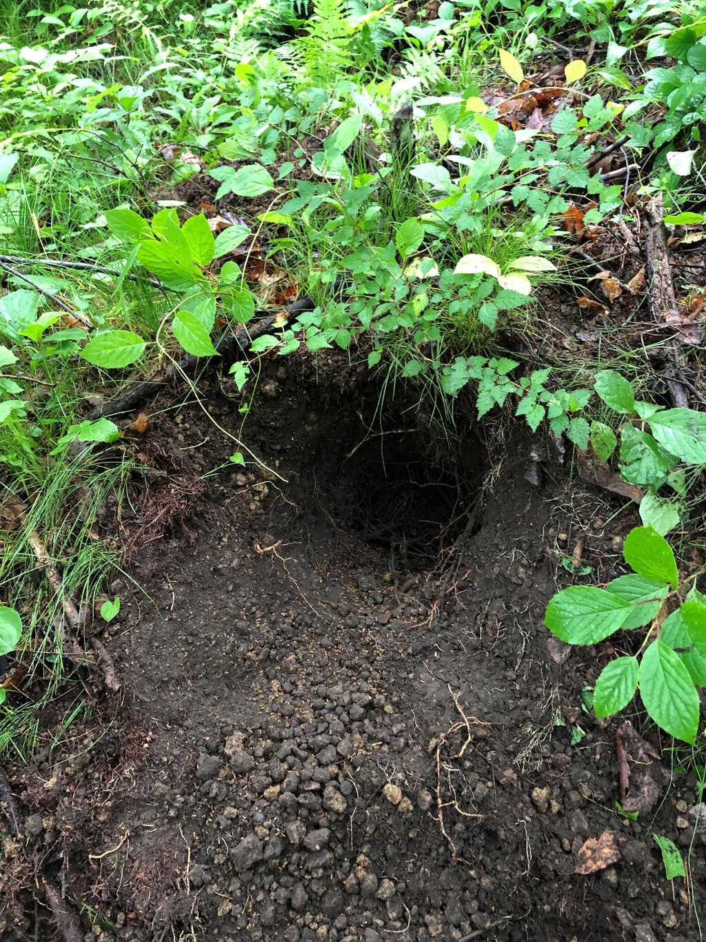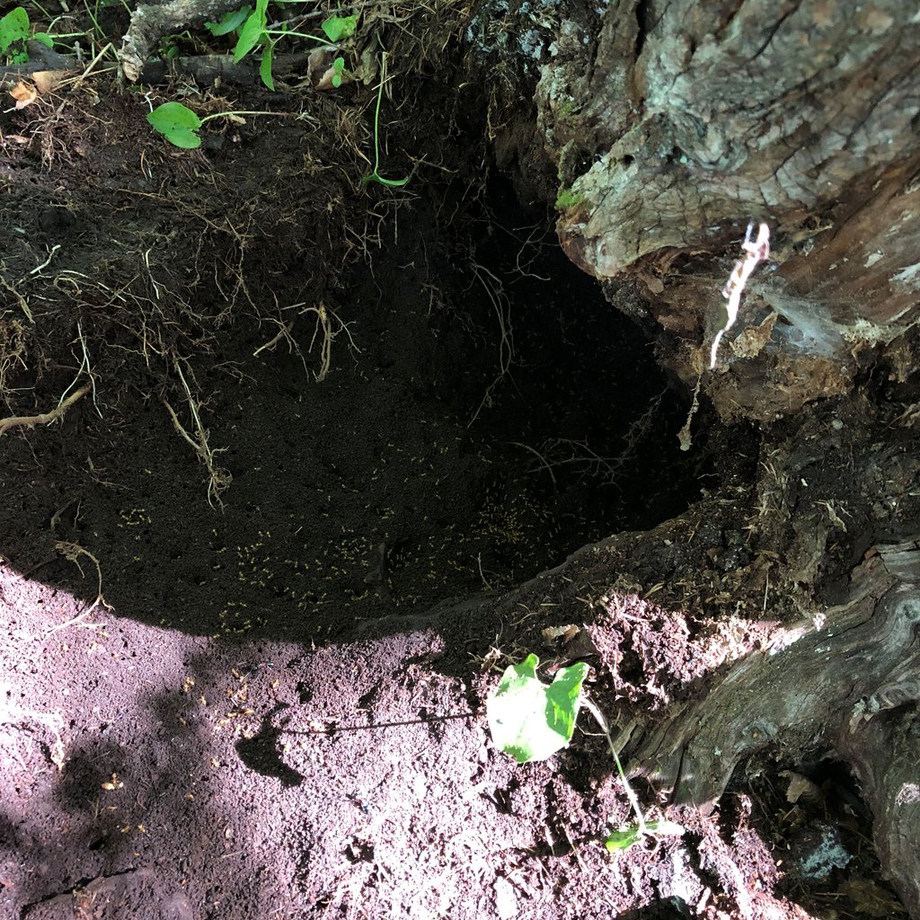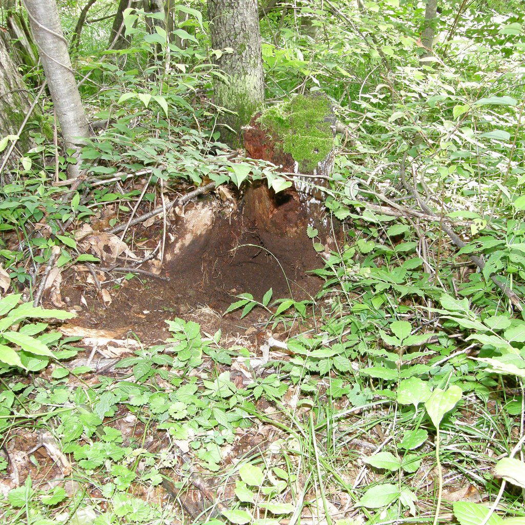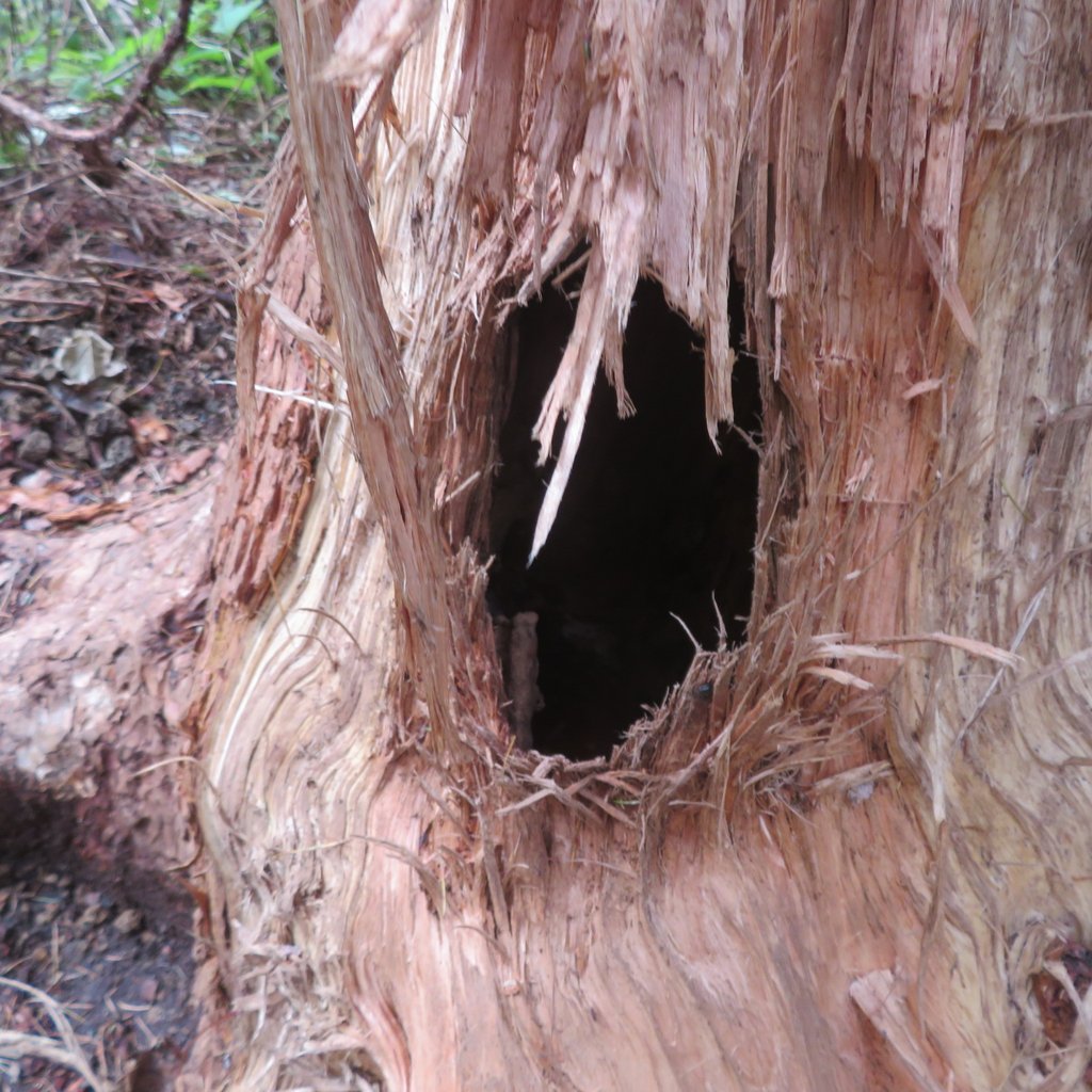 朽ち木の中や腐った風倒木、切り株の下などはアリやハチが巣を作る環境です。大きな掘り返しの跡があればクマの可能性もあります。