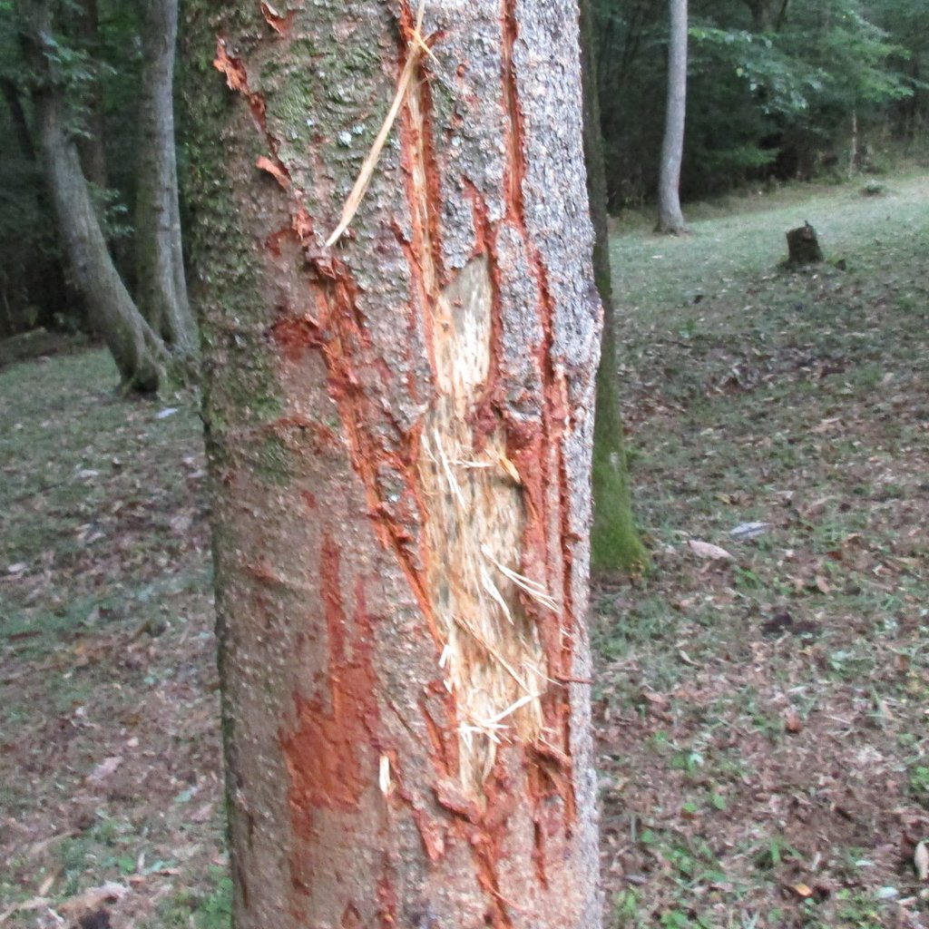 角を上下にこするため、樹皮が下から上に毛羽立つ。クマ剥ぎと異なり樹皮のめくれる面積は局所的。
