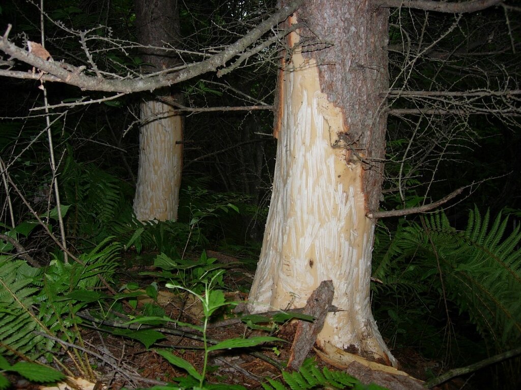 5月から6月に多く、木部をかじったり舐めたりする。針葉樹に多い。シカも同じように樹皮剥ぎをするが、規模やめくられた樹皮の断片の大きさから予測が可能。