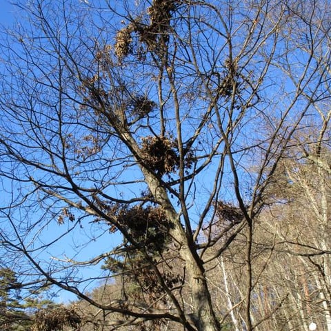 クマが木の実を食べる際にできる痕跡。木に登ったクマが、枝先の実を食べるために周囲の枝を折り、手繰り寄せることで、まるで鳥の巣のような枝の塊(棚)が出来上がる。夏季は葉が生い茂り見つけるのが困難だが、落葉シーズンになると折られた枝の葉は落ちることなく残っているため分かりやすくなる。